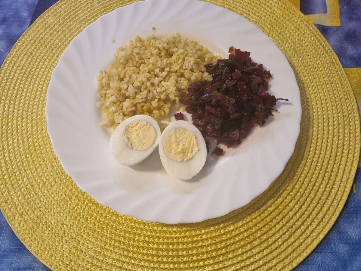 Доброе утро. На завтрак был булгур, яйцо и салат из свеклы с морской капустой. На самом деле свекла выглядит намного красивее и ярче))) Обед был доедательный, доели уху их консервы, булгур и сливочную свинину, а так же делала салат из айсберга, болгарского перца, помидора и огурца с маслом и яблочным уксусом. На ужин был суп с ленивыми пельменями и фасолью. На ужин так-то планировались индейские котлетки с кабачком, но фарш вообще не хотел лепиться, поэтому была сделана подлива "а-ля болоньезе" и рис с овощами и фаршем.