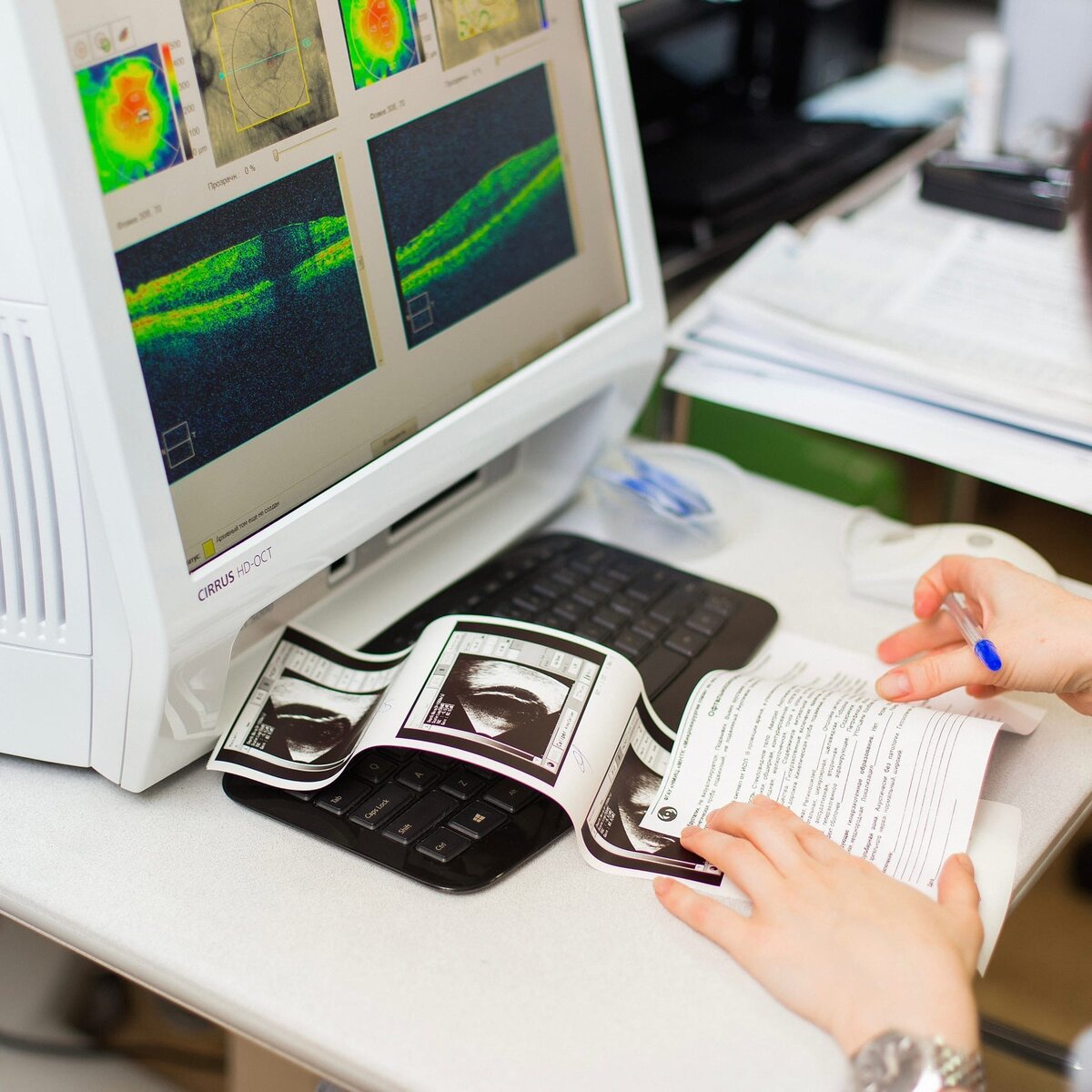 Оптическая когерентная томография (ОКТ) — универсальный метод диагностики, позволяющий получить изображение тканей глаза в высоком разрешении. Благодаря такой детализации у врача становится больше возможностей обнаружить заболевание на ранней стадии. Метод обладает рядом преимуществ перед другими видами диагностики: