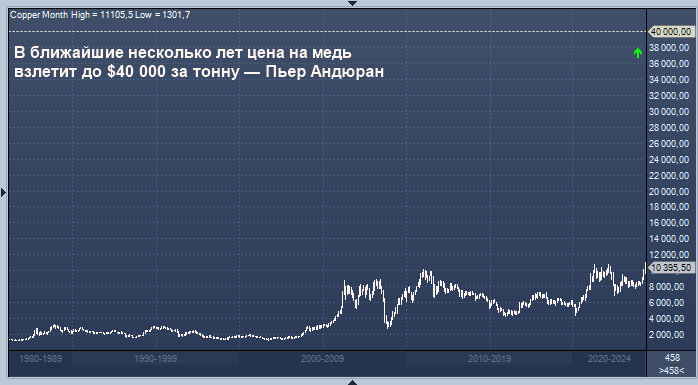 Управляющий хедж-фондом Пьер Андюран ожидает, что в ближайшие несколько лет цена на медь вырастет почти в четыре раза и достигнет 40 000 долларов за тонну, поскольку растущий спрос приведет к истощению мировых запасов этого красного металла.
