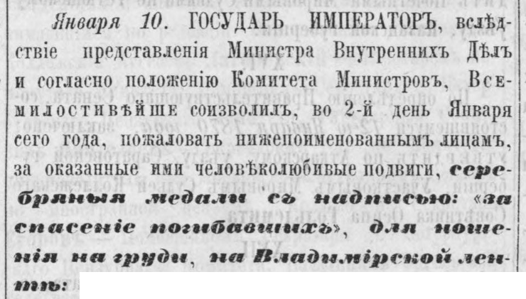 Какие награды мог получить простой крестьянин в XIX веке в мирное время? Сегодня будем смотреть списки награждённых. Нашёл много знакомых фамилий. Про военное время всё более-менее понятно. Солдаты получали медали за участие в успешных военных операциях, за подвиги и в память о прошедших войнах. Потом расскажу подробнее об этих наградах. В этой же публикации речь пойдёт о заслугах в на гражданской службе и в обычной жизни. 1870 год. Январь. Государь Император соизволил пожаловать за оказанные человеколюбивые подвиги медали "За спасение погибавших" крестьянам Тульской губернии: Медаль имела две степени отличия — золотую и серебряную. Золотой медалью награждались граждане, спасшие несколько человек. В основном спасение жизней было связано с пожарами, деревянные дома горели часто. Вот, например, описание пожара и подвига крестьянина. На месте разыгравшейся трагедии оказался крестьянин Василий Марин. Он увидел, как трое мастеровых театра выпрыгнули из окна верхнего этажа на крышу фронтона