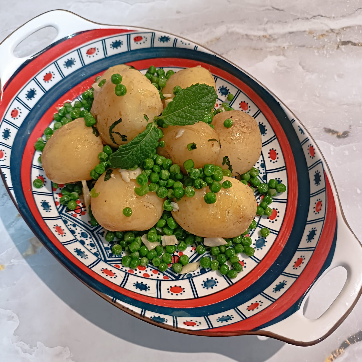Доброй пятницы и хорошего дня! Идею молодой картошки с зелёным горошком я подсмотрела у Юлии Высоцкой. Но у неё всегда ОЧЕНЬ много специй, для меня просто смертельный номер ) Я добавила немного чеснока и мяты. Молодой картофель хорошо промыть, отварить, я не очищая, т.е. с этой молоденькой тонкой шкуркой, и переложить в сковороду с топлёным маслом, добавить замороженный и размороженный ) зелёный горошек и готовить помешивая минут 5, в конце добавить порубленную свежую мяту и пару раздавленных зубчиков чеснока.