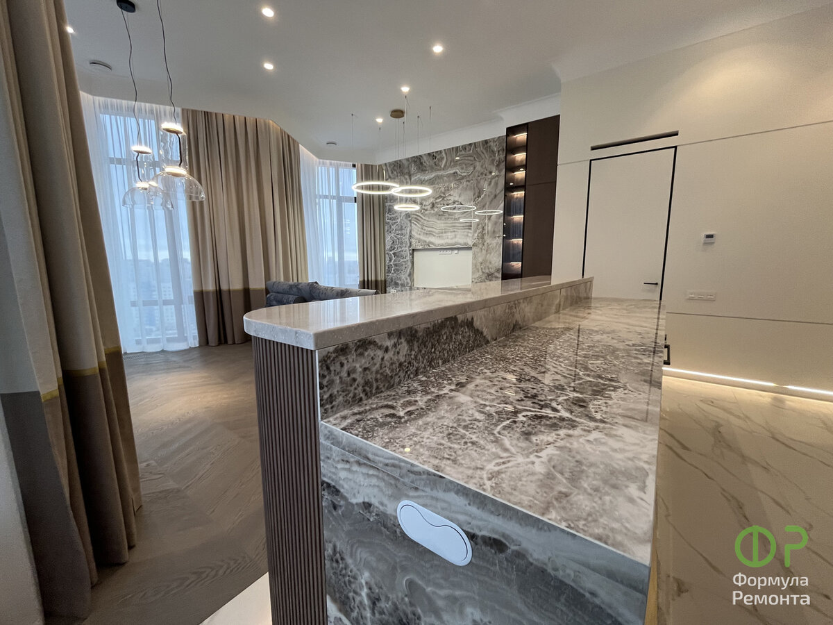 Аналогичный слэб мы использовали для облицовки кухонных фасадов и кухонного островка, чтобы помещения не казались разрозненными, но сохраняли связующие звенья. Важно, что такое решение одновременно помогает оптимизировать расходы на выполнении отделки дорогими материалами.