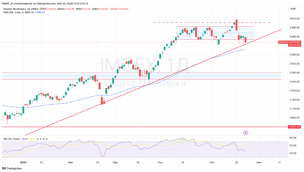 Всю рабочую неделю Индекс Мосбиржи находится под давлением. После преодоления локального максимума и возврата на докризисные значения выше 3500 п. по индексу, рынок снова ушел в коррекцию. Добавил негатива Газпром, отказавшийся платить дивиденды, Фосагро, которая перенесла решение и еще ряд компаний. 💬Вообще, тренд на отказ или перенос выплат все более отчетливый. Компании перестраховываются и придерживают прибыль. Я уже не говорю про расписки, которые все еще находятся в зарубежной юрисдикции. Думается мне, что средняя дивидендная доходность рынка в моменте сильно проигрывает доходности по вкладам в банках. 📉Сегодня Индекс вывалился из проторговки и подошел к среднесрочному уровню восходящего тренда. Недалеко проходит и 65-ти дневная скользящая средняя EMA65. Высока вероятность «склиза» вниз на 3380 п. Если медведи разовьют импульс, то и до зоны поддержки на 3251 - 3282 пп. можем добивать. Будучи долгосрочным портфельным инвестором, мне такое охлаждение рынка только на пользу. Не ис