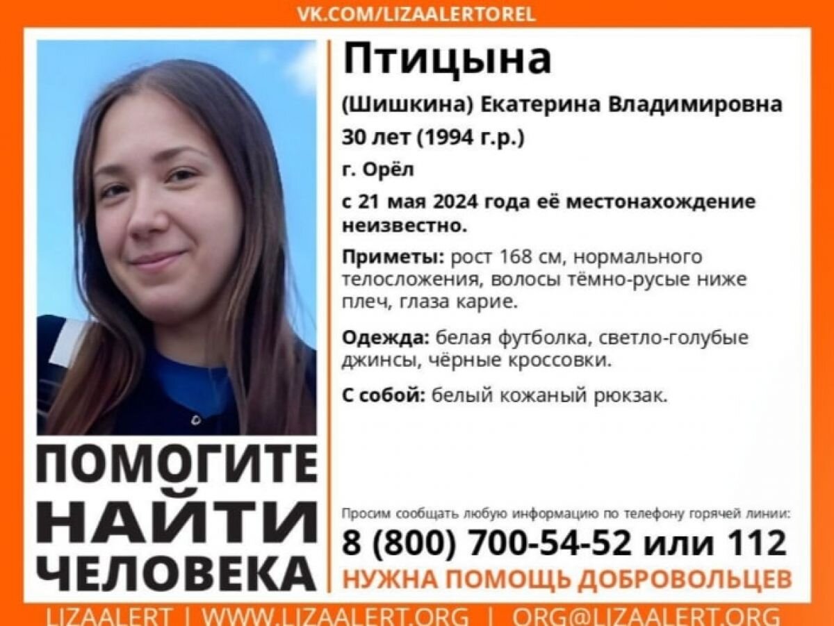 Орловцев попросили поделиться записями с видеорегистраторов, которые могут помочь в поисках пропавшей женщины. Сообщение появилось в сообществе поискового отряда «ЛизаАлерт». Пригодиться в поисках могут видеозаписи тех, кто двигался на автомобиле 21 мая с 11:00 до 13:00 по трассе Р-120 от перекрестка Карачевского шоссе и улицы Мостовой до пгт Нарышкино. Орловцев, готовых помочь, просят позвонить на горячую линию отряда по номеру 8(800)700-54-52, либо связаться с инфоргами поиска - Софьей (Корона) по номеру 89253473458 и Натальей (Сова) по номеру 89202855304. Напомним, в Орле пропала 30-летняя Екатерина Птицына (Шишкина). Девушка была одета в белую футболку, светло-голубые джинсы и черные кроссовки. При себе у нее имелся белый рюкзак.