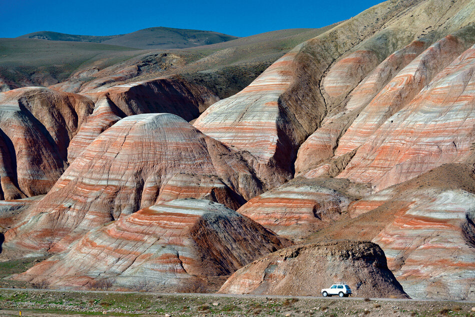 Расстояние от Баку: около 100 км Направление: север Время в пути: 1,5 часа На сколько дней ехать: одним днем или с ночевкой Хызы – ближайшая к Баку и совершенно особенная горная местность. Сюда легко можно съездить из города одним днем – полтора часа быстрой езды по хорошей асфальтовой дороге. Место назначения узнается сразу: вот вы ехали по привычной обжитой трассе, останавливались купить горячего лаваша из тандыра у дороги, и вдруг все привычные картины в мгновение ока сменил совершенно космический пейзаж. Тяжелое небо словно давит на низкие покатые горы, и горы эти – на них ни деревца – разноцветные. Рекламные проспекты называют их «леденцовыми» или «карамельными». В солнечный день хызынские горы, окрашенные в белые, красные, розовые полоски, действительно могут напомнить детские горки из надувного луна-парка, но не меньше им идет мистический предзакатный сумрак. Припарковать машину на обочине, подняться на первый холм, потом на другой, третий – и вот уже нереальные полосатые горы р