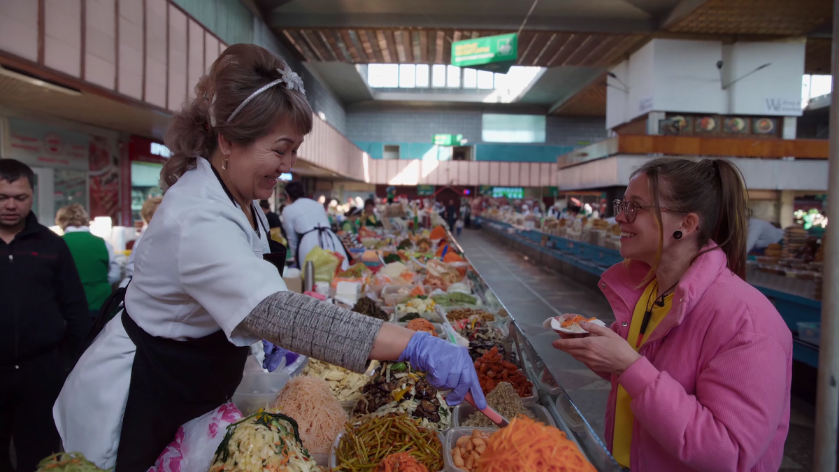 Чарт открывает алматинский Зеленый базар. Тут ни за что не пройти мимо восточных салатов и прочих солений. Мы зависли у ряда надолго и даже успели наесться. Перед покупкой принято сначала попробовать продукт, а мы и рады.