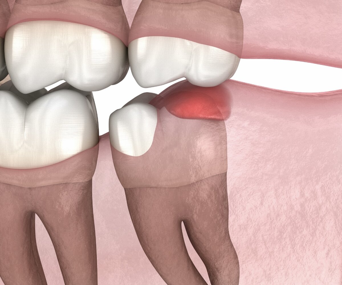 Перикоронарит или перикоронит — это воспаление десны над прорезывающимся зубом. В основном возникает над восьмерками, также называемыми «зубами мудрости». Обусловлено это тем, что эти зубы прорезываются последними и процесс может занять долгое время. Или в челюсти уже не хватает места, поэтому зуб растет под углом, а может и вовсе не показаться. В данных случаях над зубом образуется «капюшон» из десны. Самостоятельно прочистить затруднительно, поэтому там скапливается большое количество остатков пищи, что приводит к размножению микроорганизмов. Перикоронарит начинает проявляться болезненными ощущениями, а также покраснением и отечностью десны. Если вовремя не вмешаться, то боль усиливается и отдает в ухо или висок. Становится трудно глотать и открывать рот. Повышается температура, увеличиваются лимфоузлы. Может появиться гной. Домашнее терапия фактически невозможна из-за недоступности очищения пораженного пространства. Стоит как можно быстрее обратиться к врачу, дабы сократить риск п