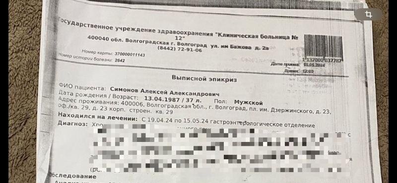 Волжанин Алексей Симонов проходил стационарное лечение в ГУЗ КБ № 12 (волгоградская больница № 12) с 19 апреля до 15 мая 2024 года. Уже на второй день после выписки ему стало крайне плохо — появились сильные боли в животе. В ночь на 18 мая открылось кровотечение и появилась рвота с кровью. Родные Алексея оперативно привезли его около 5 часов утра 18 мая в больницу № 12. Именно в это время там должен был дежурить врач, который наблюдал Алексея в течение месяца, когда тот находился на лечении в больнице.