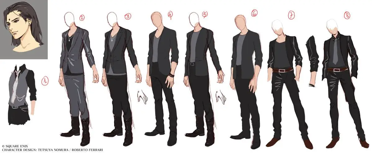 На полном листе концепт-арта Final Fantasy VII Remake and Rebirth изображены семь возможных костюмов, которые мог бы носить Ценг вместо костюма, который мы видели в игре. В крайнем левом углу мы видим вариант прически, предполагающий, как он мог бы выглядеть с распущенными волосами.
