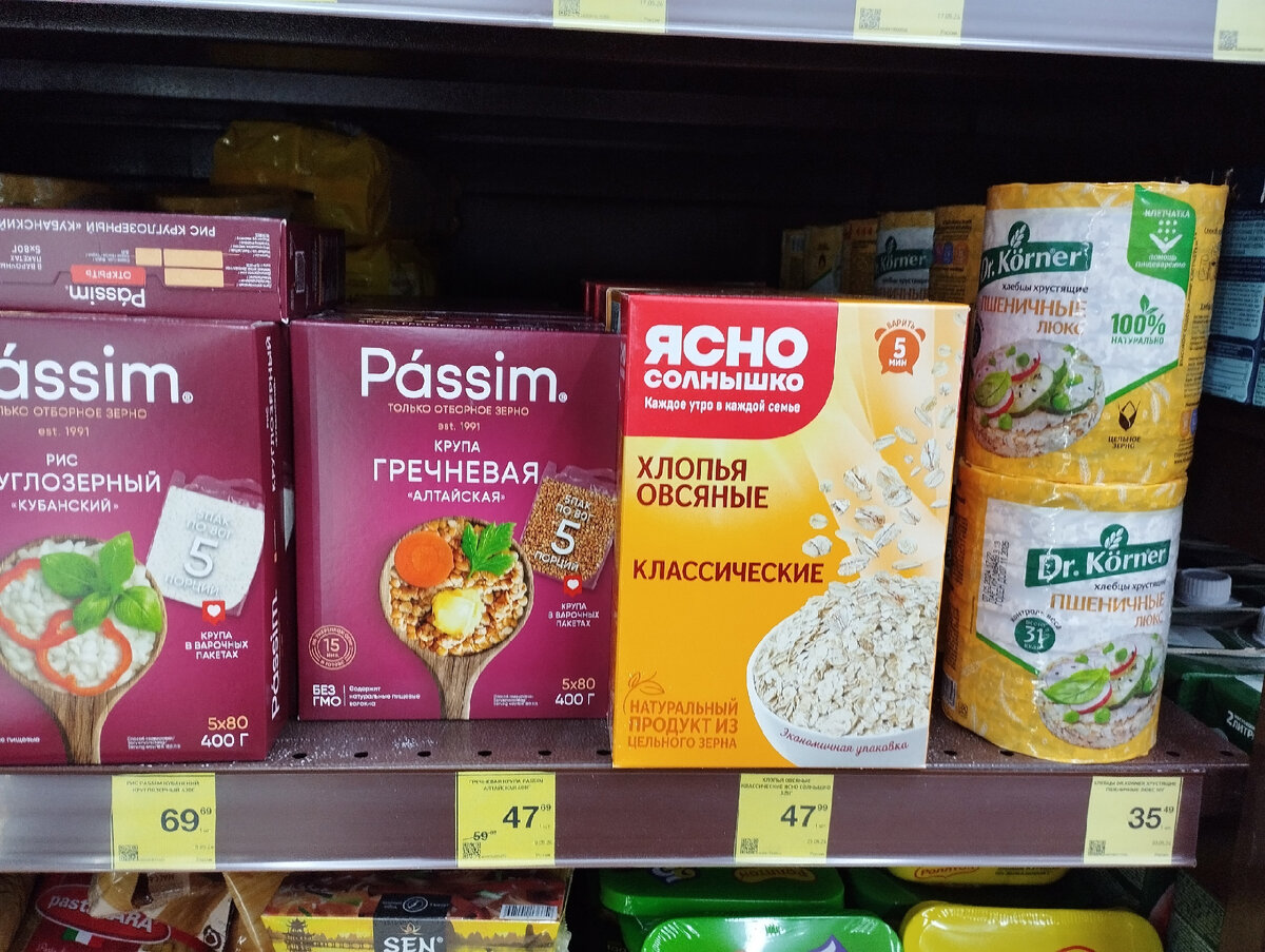 Неожиданно много скидок в этот раз подготовил магазин "Красное&Белое" на продукты, но, увы, не обошлось и без некоторых условий, чтобы мы могли сэкономить - зачастую скидки разработаны так, что нам нужно покупать по несколько одинаковых товаров. С одной стороны, конечно, это минус, особенно если не рассчитываешь приобретать много, а с другой - цены взамен предлагаются очень уж привлекательные. Об актуальных скидках и предлагаю поговорить в этом обзоре, тем более что я уже сходила в магазин (25 мая), рассмотрела практически каждую полочку и нашла то, что хотела бы купить и сама. Что же, перейдем к желтым ценникам и обсудим их? Давайте обо всем, но по порядку: Первая скидка ждала меня на полке с бакалеей, она еще и самая обычная, действует на любую покупку. За 47 рублей выставлена гречневая крупа, между прочим в упаковках для варки, очень удобный вариант, а цена действительно низкая. Я после этой находки была в супермаркете, смотрела сколько там стоит самая недорогая греча, так цена была