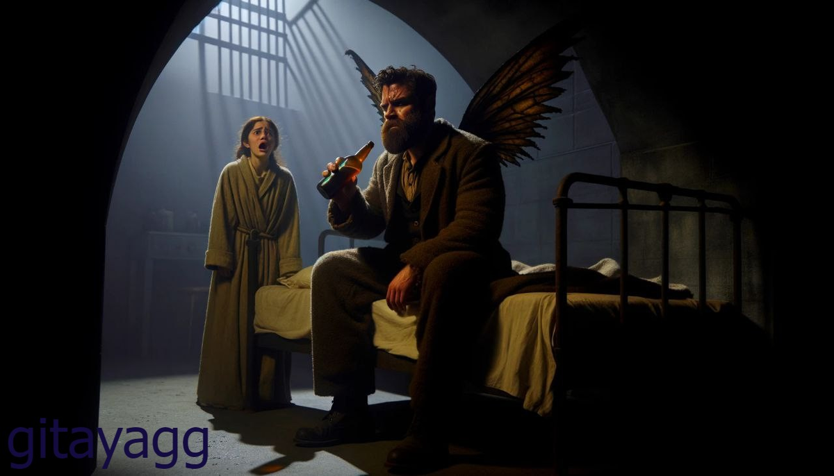 Огромный мужчина с крохотными крылышками, которые ему были явно малы, приземлился на кровать. Достал из кармана бутылку и сделал длинный глоток. Занюхал крылом, и вытащил мятый лист бумаги с пятнами. Вчитался.