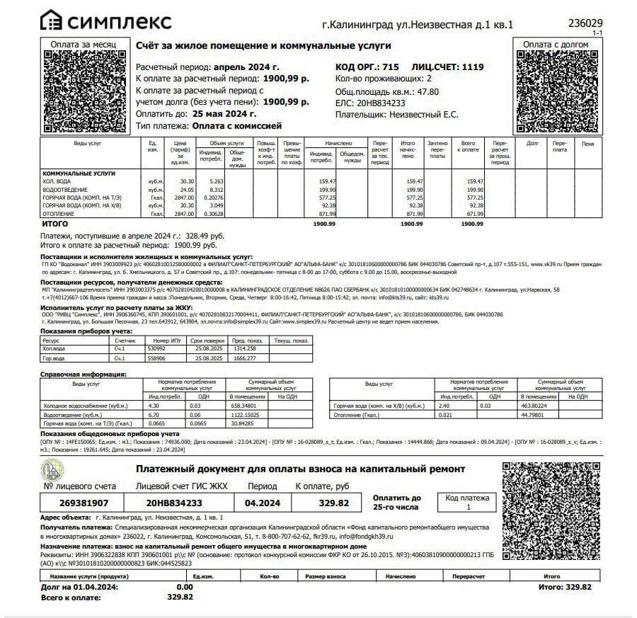 Иллюстрация: Telegram-канал Фонда капремонта Калининградской области Единые квитанции на оплату жилищно-коммунальных услуг в Калининградской области получили 96 тыс. абонентов. Об этом сообщили в региональном фонде капремонта. «Новые квитанции доставляют в 12 муниципальных образованиях. Среди них Ладушкинский, Янтарный, Пионерский, Правдинский, Советский, Мамоновский, Озёрский, Краснознаменский и Нестеровский округа, а также Калининград. Расчётный центр „Симплекс“ ежемесячно увеличивает число единых платёжных документов для жителей Калининградской области», — говорится в сообщении. Пока в одну квитанцию удалось объединить платежи ФКР, «Водоканалу» и «Калининградтеплосети». При этом платить за капремонт нужно по отдельному QR-коду. Он находится в нижней части квитанции справа. О разработке единого платёжного документа для жителей региона стало известно в начале года. Как пояснял министр строительства и ЖКХ региона Сергей Черномаз, включить ЕСОО в одну квитанцию сложнее из-за кассовых ра