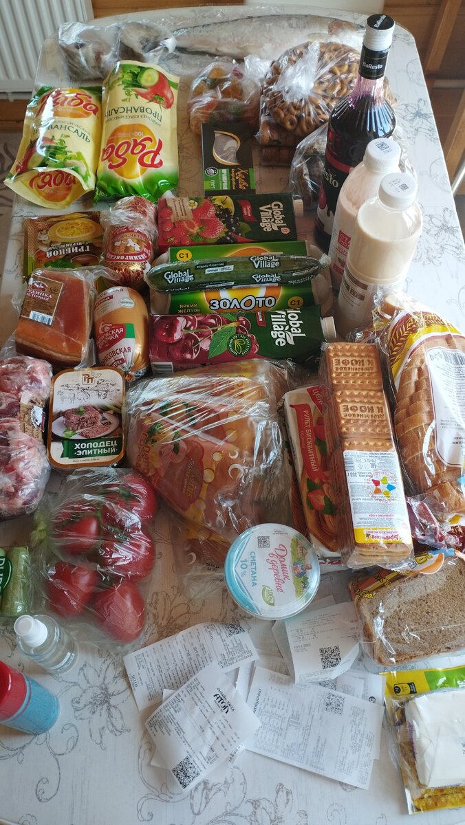 Сегодня опять не до огорода. Нужно было ехать за провизией и решили ещё заказать новую калитку. Проездили пол дня . Еды,как всегда,целая куча,надо и не надо Взяли всяких вкусняшек,что бы с чаем было чего перекусить в беседке Ветчина,колбаса,холодец и грудинка,хватит на долго. Даже купила ,и очень дёшево ,суп в пакетах всего за 23р. пакетик. Приехали и сразу сварила,вкусно Рыба, стейки пикшы и форель посолить,давно не брали Вот этого сама не за что не взяла бы,но муж любитель попить из этих пакетов. А в большой литровой бутылке вишневый сироп Ещё купили средства от комаров. Цены,просто,ужасные. За два пузырька отдали 630 р. После обеда рыбу разделала,как обычно,часть уже засолила А голова,косточки ,хвост завтра на суп Форель была очень хорошая,жирная и цвет замечательный. Вечером добралась до огорода,но только полила. Сегодня заморозков не передают,убрали все укрытия,ох,как надоело таскать взад-перед. Пока. Всем Мира и Добра !