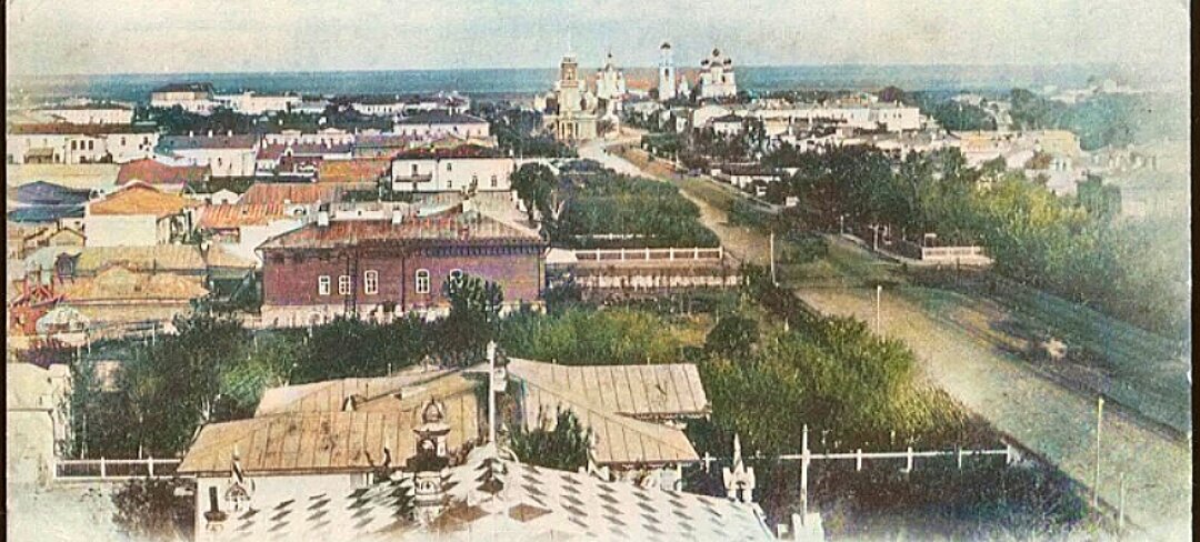 Старый Тамбов ул. Широкая участок Садовый дорога идущая на Казанский монастырь упиралась в Уткинский Храм немного сворачивая в право продолжала направлялся к мужскому монастырю. Именно этот участок с таким названием нанесён на старых картах 200 летней давности. Здесь была насыщенная Зелёная зона много растительности сады которые выходили на улицу делившею город пополам. Позже данный участок начал называться Дворянский в связи с построением нового здания Тамбовского Дворянского собрания. Фото сделано с деревянной смотровой площадки на вершине башни именуемой каланча.
