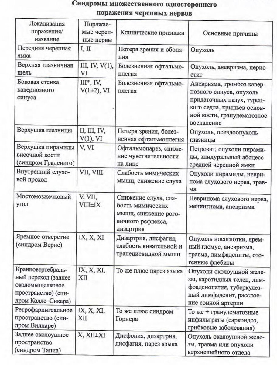 КРАНИАЛЬНЫЕ НЕВРОПАТИИ МНОЖЕСТВЕННЫЕ - множественное поражение черепных нервов в результате локального процесса на основании черепа или субкраниальном уровне либо мультифокального патологического процесса. При локальном процессе обычно наблюдается одностороннее поражение соседних черепных нервов. Причины невропатии черепных нервов Причинами могут быть травма, опухоль или аневризма, гранулематозная инфильтрация (например, при саркоидозе или гранулематозе Вегенера), инфекция (например, опоясывающий герпес). Последовательное поражение глазодвигательных нервов может быть проявлением рака носоглотки, а поражение бульбарных нервов бывает вызвано краниовертебральной аномалией. Последовательное вовлечение всех черепных нервов с одной стороны обозначается как синдром Гарсена (гемибазальный синдром). Почти всегда он является признаком опухоли костей основания черепа (чаще всего хондромы или хондросаркомы ската). Синдромы множественного одностороннего поражения черепных нервов и их основные причи