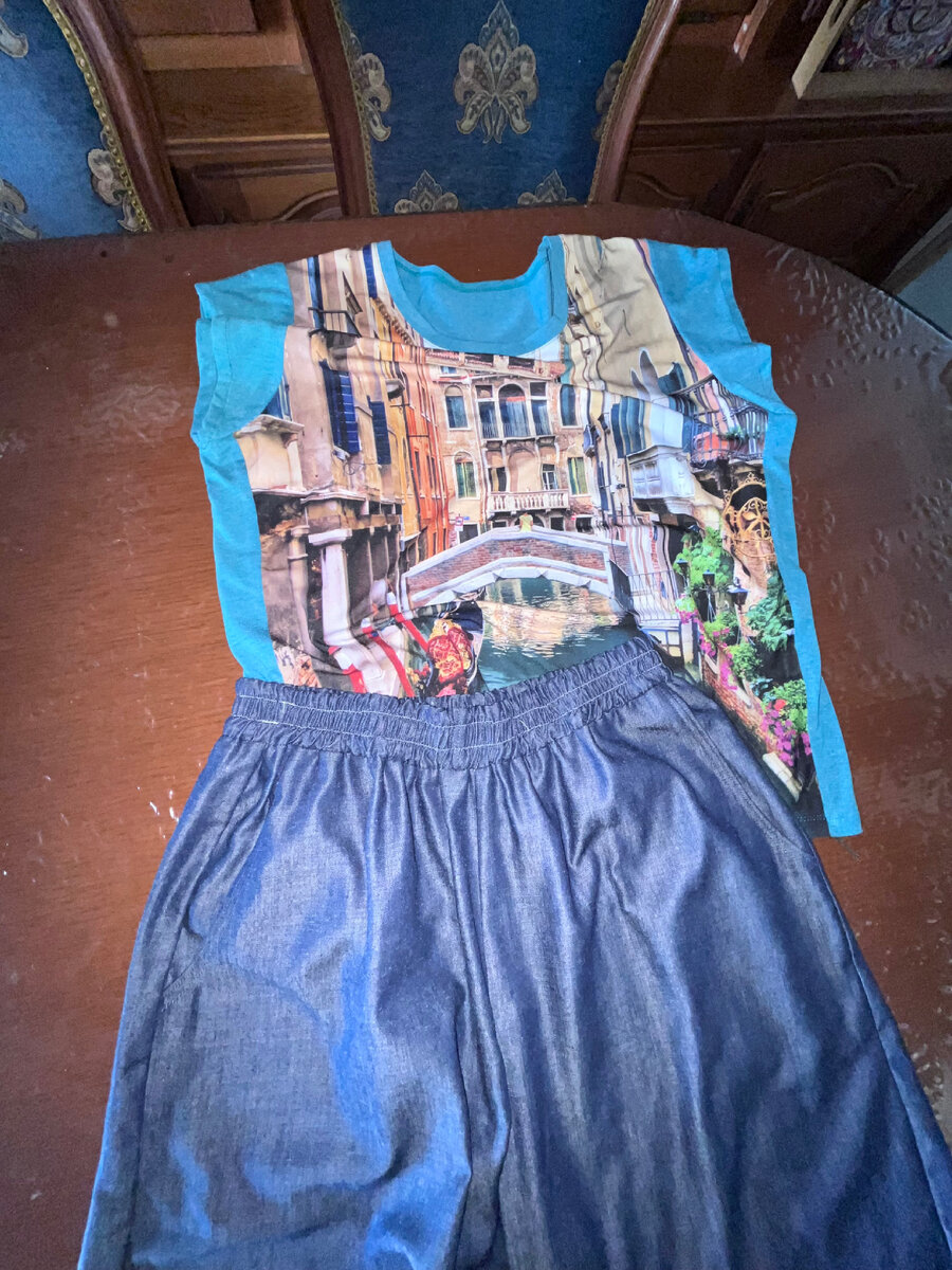 Сегодня опять был поздний завтрак 👍 Я встаю и могу с утра шить, пока заряд есть🤣😃😃😃, или зарядка 😉 Обед буду готовить попозже,а пока я сшила брючки летние себе! Это чтобы не быть сапожником без сапог! Давно хотела летние джинсы, из тонкой ткани, которая выглядит как джинсовая. И вот, совершенно случайно, я нашла такую ткань! Причём зашла в магазин просто на удачу и она мне улыбнулась😃удача, я имею ввиду! Так что брючки я почти закончила, сейчас приготовлю обед и закончу их. Брюки самые обычные, на резинке, с карманами. Самое то для лета! Ещё и новую переделку свою затеяла . Вчера всё распорола и наметала. Может к вечеру закончу, просто не хочется лишний раз менять нитки в оверлоке. Всё закончила, осталось выгулять ! Вот и вечер наступил. А я всю работу закончила 👍💪💪💪 Кто -то скажет, сколько у тебя вещей??😃😃Но таких брюк ещё не было! Я хотела именно такие , из тонкой джинсы, или это ткань похожая на джинсу. Блузку вчера распорола, а сегодня сделала новую версию . Н