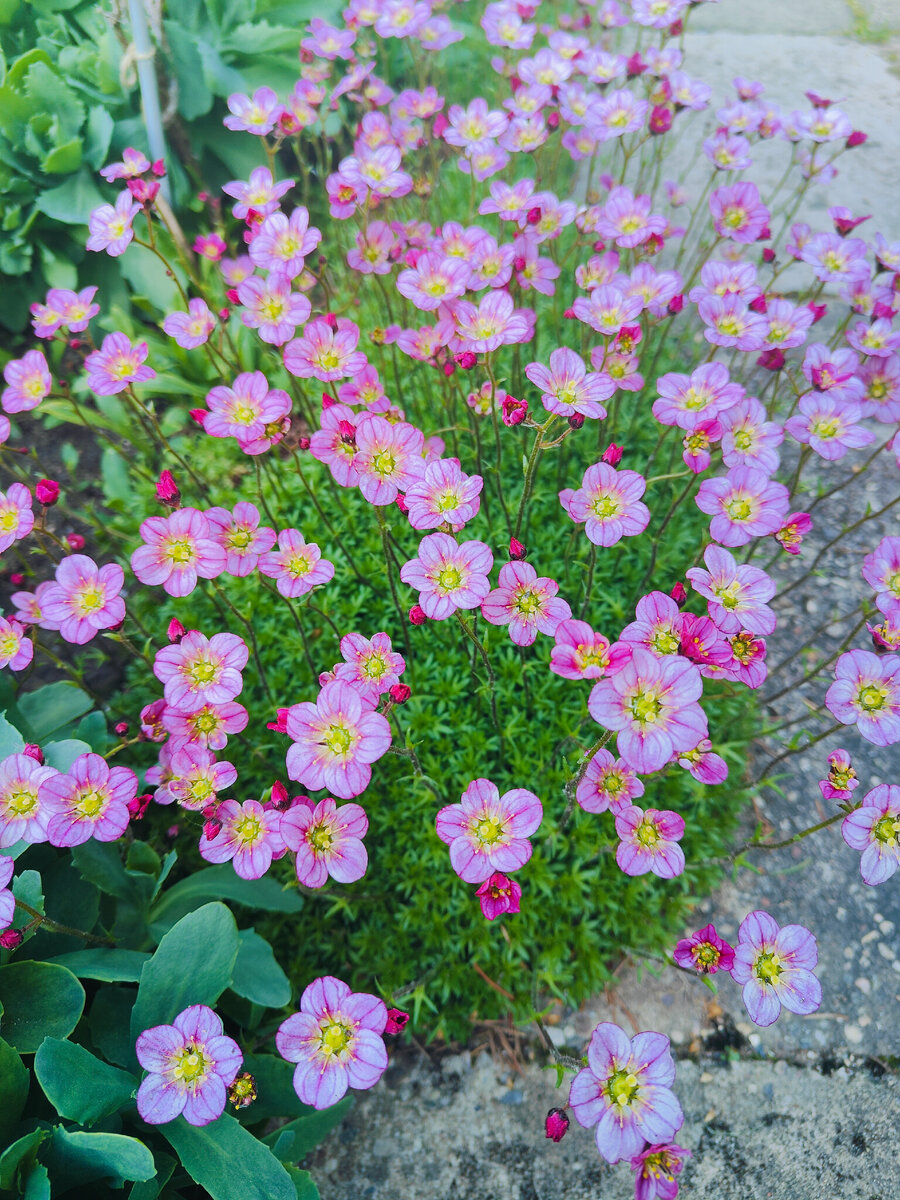 Май - это месяц самых быстрых перемен а саду. Буквально за день-два сад может измениться очень сильно. Каждый день на даче распускается что-то новенькое. Очередная волна тепла даёт возможность растениям гнать бутоны в ускоренном темпе. На камнеломке Арендса, как по мановению волшебной палочки, одновременно раскрылось множество одиночных розовых цветков. Прострел зазвонил в свой второй карминный колокольчик. Я не ожидала, что камнеломка так стремительно приблизится к нему всего за год. Вот теперь не знаю, что делать: то ли прострел отсаживать, то ли форму кочки у камнеломки менять... Ни того, ни другого не хочется ... Белая камнеломка уже неделю стоит цветущая. Новенькая примула Зибольда порадовала меня нежным сиреневым соцветием. А вот прошлогодняя голубоватая выглядит как-то странно, что-то у неё с лепестками непонятное, загибаются вперёд. Не могу пройти мимо сияющего красотой махрового мускари. Соцветия стали огромными, почти шаровидными. Он реальная звезда цветника! Кстати, "Самы