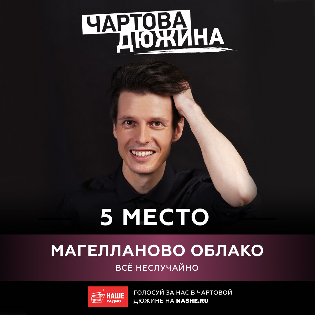 Друзья, вы молодцы! Ваши голоса подняли нашу песню "Всё Неслучайно" на 5 место! Верим, что на этой неделе вы сможете поднять песню еще выше! Голосуйте, пожалуйста, за "Магелланово Облако" каждый день по 3 раза на сайте https://www.nashe.ru/chartova