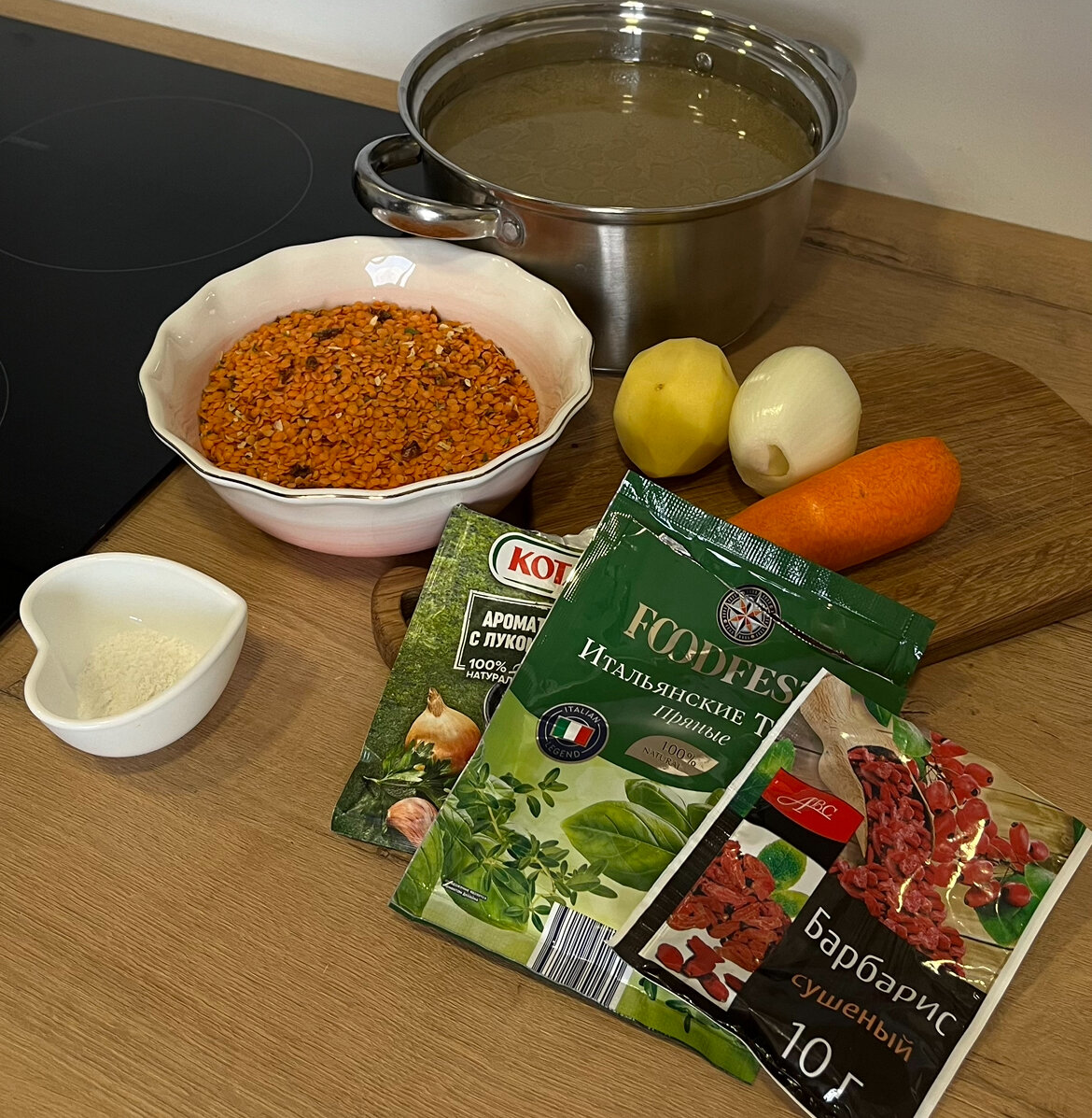 В кастрюлю с водой, ложем мясо на кости, отвариваем 3 часа. Готовый бульон процеживаем. Получается бульон 1, 7 литра. В бульон добавляем картофель и чечевицу, варим 20 минут. Лук с морковкой пассируем на медленном огне. Добавляем итальянские травы, барбарис сушеный, томатную пасту или домашний кетчуп. Для остроты можно добавить аджику. Обжаренный лук с морковью добавляем в бульон, варим 20 минут. Далее пюрируем блендером. Чечевичный крем — суп готов 🙌🏽 Посыпаем петрушкой 🥦 Ингредиенты: Вода - 3 литра Чечевица - 250 грамм Мясо на кости - 750 грамм Картофель - 1 штука Морковь - 1 штука Всех трав - 1,2 чайной ложки Соль, перец (по вкусу) Томатную пасту или домашний кетчуп - 2 столовые ложки Зелень (петрушка, на выбор) Приятного аппетита 😋
