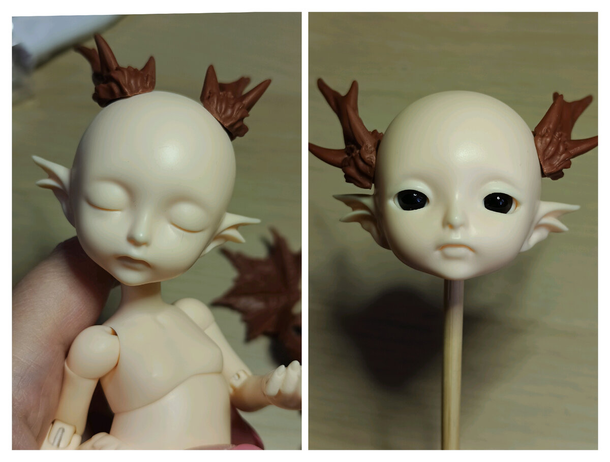 Добро пожаловать в мастерскую magic_dolls, ООАК! Продолжаю рассказывать о создании малыша-дракона. Напомню, что у нашего дракоши будет два образа и два лица. Одно лицо - со спящими глазами. Его мне предстояло превратить в сердитого малыша-дракона. А второе лицо так и останется милым. И человеческим. Начала я с сердитого. Сначала мне пришлось спилить "спящие веки" на этом лице. Фото сделать забыла, но на первом слое росписи вы все увидите. Первый слой. Карандаши на этом пластике рисуют ярко, хотя раздражает излишняя шероховатость поверхности. Показала Людмиле. Она предложила нарисовать всю поверхность глаза зелёным цветом, как у драконов. И сделать в глазах жёлтые частицы. Брови решено было сделать менее заметными, с более редкими волосками. Теперь надо усилить тени, чтобы придать лицу более потусторонний и драматичный вид. Ведь это лицо не просто сердитого дракона, а в момент его превращения из человека в дракона. Осталось поставить блики. И нарисовать драконьи зубки. Была п