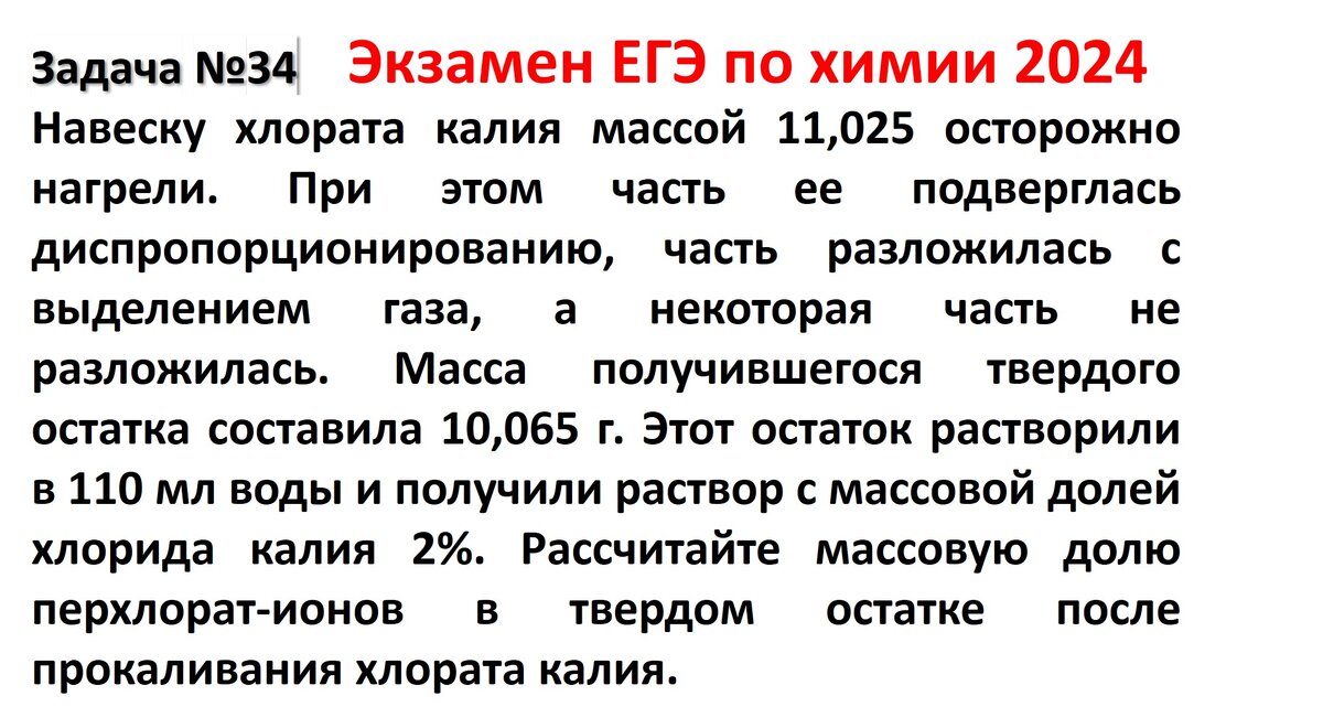задача 34 Навеску хлората калия массой 11,025 осторожно нагрели. При этом часть ее подверглась диспропорционированию, часть разложилась с выделением газа, а некоторая часть не разложилась. Масса получившегося твердого остатка составила 10,065 г. Этот остаток растворили в 110 мл воды и получили раствор с массовой долей хлорида калия 2%. Рассчитайте массовую долю перхлорат-ионов в твердом остатке после прокаливания хлората калия. Решение: 1) В задаче одна наша навеска массой 11.025 г разделилась на три части: Отметим, что по реакциям образовалось только одно газообразное вещество и значит разница в массе навески и твердого остатка будет равняться массе кислорода: