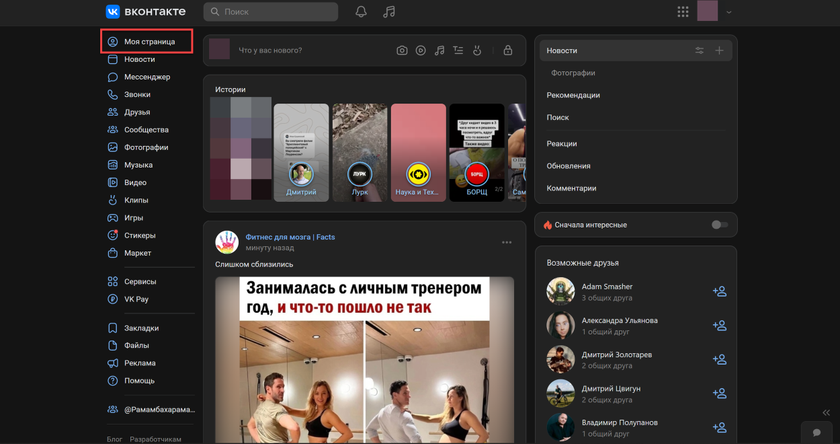 На главной странице профиля щелкните по пункту «Моя страница» в левом столбце.