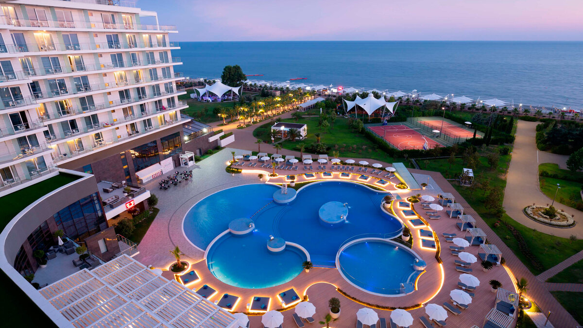 Отель находится на первой линии, в нём есть двухуровневые люксы и небольшие студии. На территории — бассейны (+30 градусов), детская и спортивная площадки. За доплату в номера можно заехать с питомцем.
