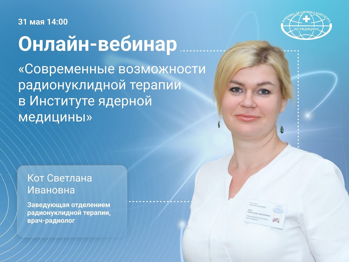 АО «Медицина» (клиника академика Ройтберга) совместно со структурным подразделением Институт ядерной медицины в г. Химки, МО проводит вебинар, посвященный современным возможностям радионуклидной терапии. Рассмотрим современные радиофармацевтические лекарственные препараты и эффективные методы радионуклидной терапии, которые успешно применяются в Институте ядерной медицины с подтвержденным клиническим эффектом, а также - показания и противопоказания для этого вида терапии.