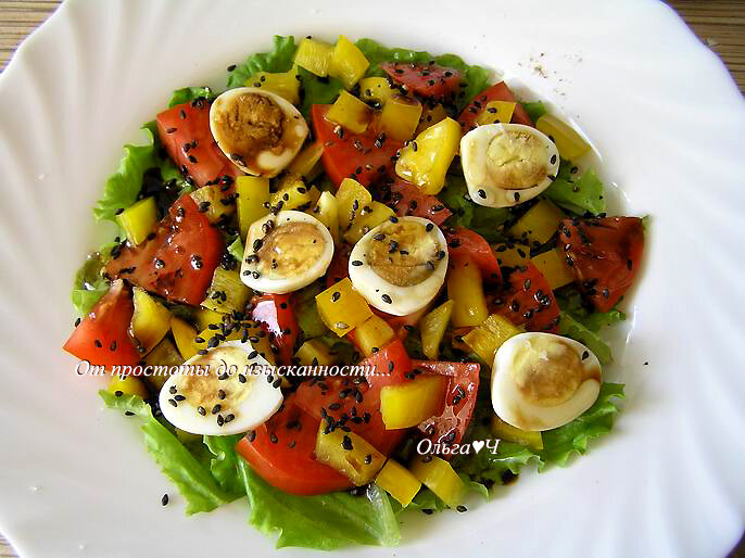 Сверху выложите перепелиные яйца, разрезанные пополам, посыпьте кунжутом.