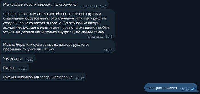 Вот так и живут, общество внутри общества, экономика внутри экономики... даже доллары и евро на рубли меняют в чатах телеграмма)) и никакое государство не нужно, точнее оно не имеет значения, главное чтобы интернет был.