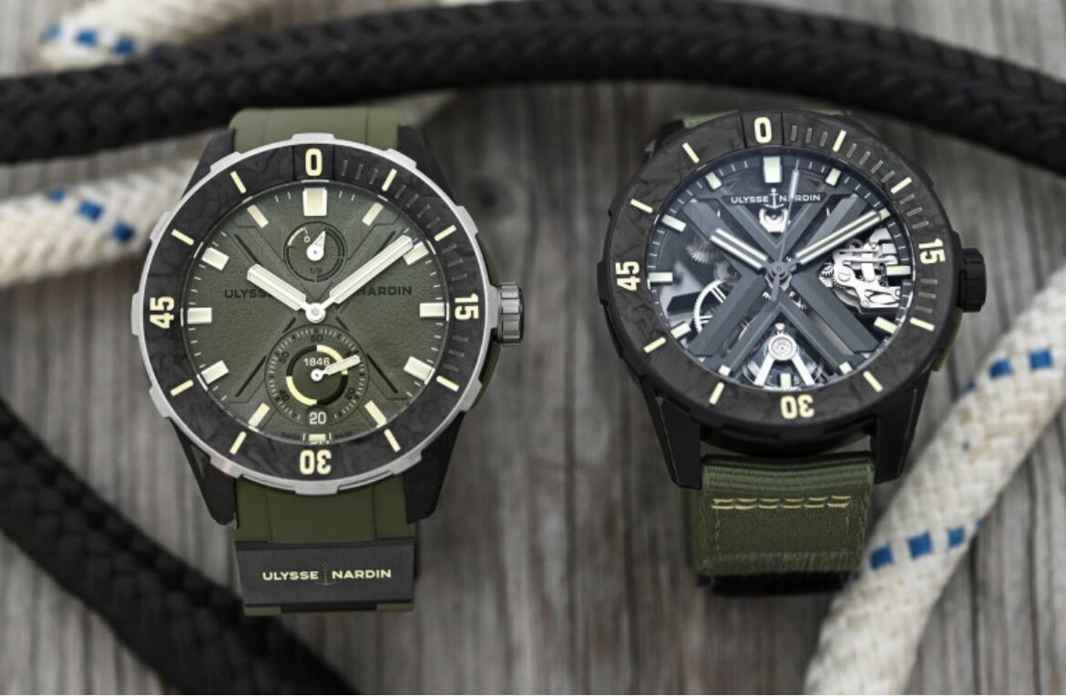 Часовой бренд представил две новые модели в камуфляжном оформлении, выполненные с упором на экологичность. Ulysse Nardin Diver Net OPS изготовлены из переработанных нержавеющей стали и рыболовных сетей и углеродного композита карбониума. Модель имеет корпус 44 х 14,81 мм и водонепроницаемость 300 метров. На вращающемся безеле из карбониума находится мраморный рисунок, циферблат цвета хаки украшен вырезанным по центру Х-образным элементом. Стрелки светятся в темноте. Индикатор запаса хода расположен у 12-часовой отметки. Сердцем часов является базовый калибр Ulysse Nardin UN-118, оснащенный спуском DiamonSil и кремниевой спиралью баланса. Механизм собран из 50 камней, оснащен автоподзаводом, работает с балансовой частотой 28800 пк/час и имеет запас хода 60 часов. Ориентировочная стоимость — CHF 12,600. Модель Ulysse Nardin Diver X Skeleton OPS отличается от первой более низкой водонепроницаемостью (200 метров), большей толщиной корпуса (15,7 мм), а также титановым корпусом и задней кры