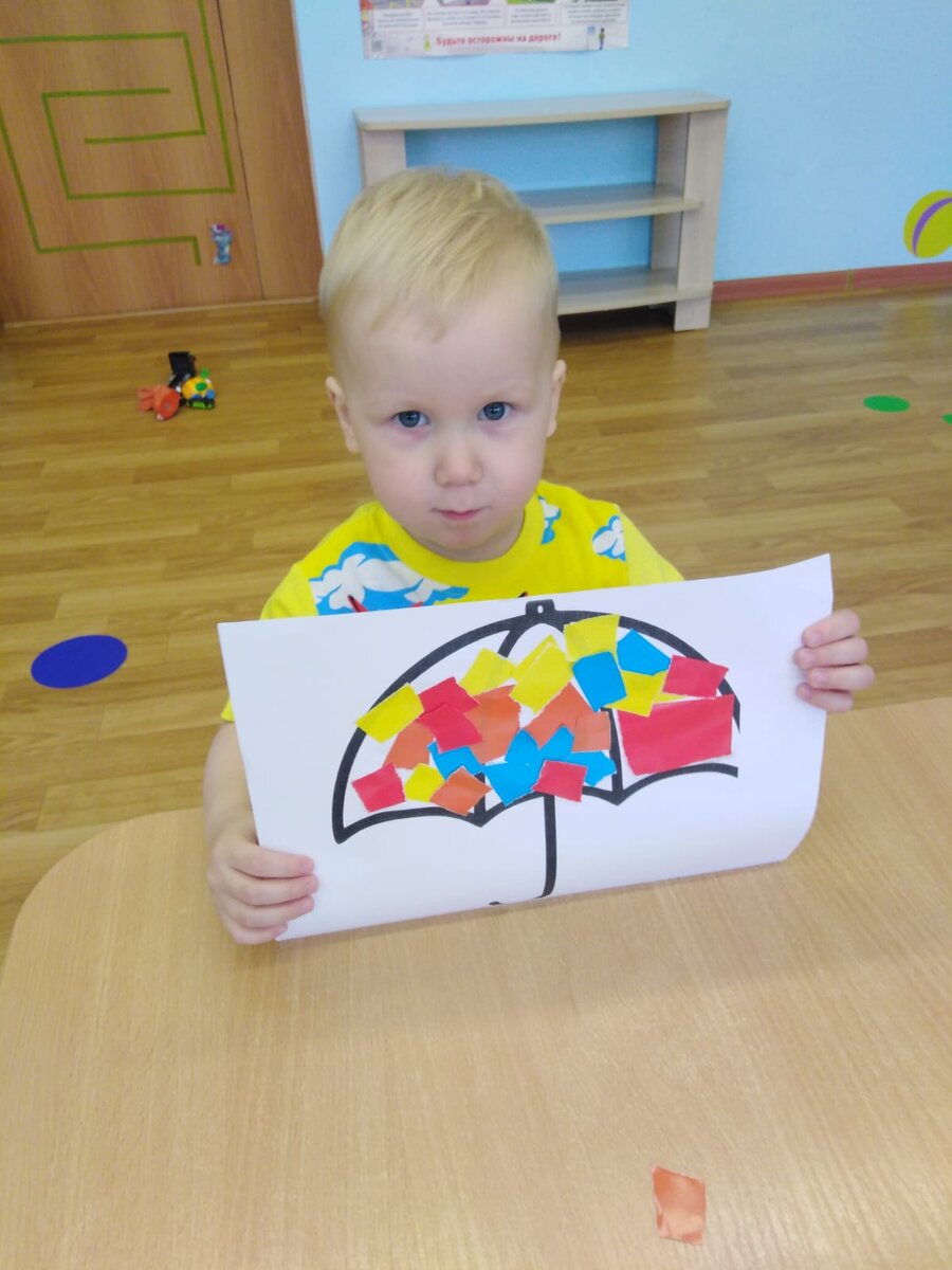 Для аппликации необходимо взять лист бумаги А4, нарисовать или распечатать на нём зонтик, а затем разноцветными кусочками бумаги порванными на мелкие части, заполнить пространство внутри зонтика