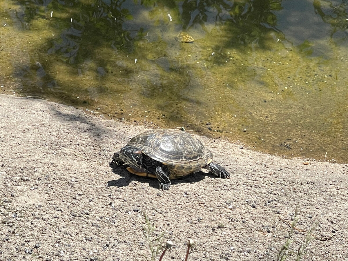 На днях мы гуляли с дочкой на прудах, и когда шли домой мимо каскада прудов, я вспомнила , что в начале весны видела тут черепаху). Да )), водную черепаху , жительницу южных широт . В апреле еще и сейчас в мае)). Сейчас уже бодрая и самодостаточная). И захотелось и дочке ее показать), я пошла смотреть в то самое место и вот только я прошла, как вдруг за спиной дочка мне кричит : — Мама, мама черепаха! Пока я включала телефон ), черепаха очень бодро выбежала из воды и осталась греться на солнышке. Красноухие черепахи - это пресноводные черепашки и они могут подолгу задерживать дыхание и лежать на дне, могут плавать , но так же еще и любят понежиться на солнышке, посидеть позагорать на камушке или берегу. Поэтому лето в наших реалиях вполне сносно для ее проживания в московских прудах! Но она хищник , дома можно покупать специальный корм для водяных черепах или гамариус ( микрокопия креветок)) или даже многие фарш дают, куриные яйца. А в пруду она сама за себя! Пока в первый раз