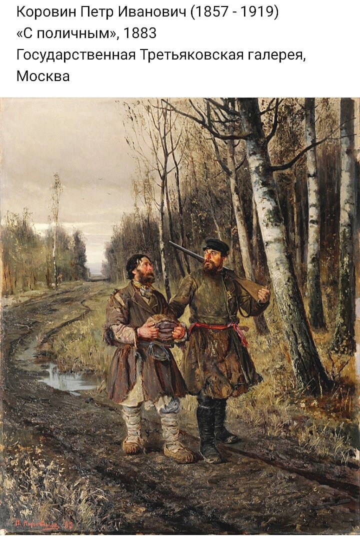 Второе название картины "Полесовщик". Пётр Иванович Коровин был награждён серебряной медалью в 1883 году за эту картину. Полесовщик - это лесник, который был поставлен охранять барские угодья от крестьян, которые крали у господ лес для того, чтоб отапливать свои избушки долгими зимами, потому что лесные угодья были частной собственностью помещиков, а на скудных земельных наделах крестьян выращивать деревья, да ещё и на дрова, было нереально. Картина прекрасная! Сразу вспоминается рассказ Тургенева "Бирюк". И не могу подобрать слов, чтоб выразить - как сильно мне жаль этого несчастного человека в оборванной одежде!!!