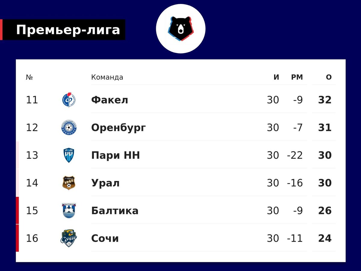 Сразу прощаемся с «Балтикой». Пока «Динамо», «Краснодар» и «Зенит» решали, кто станет чемпионом, внизу таблицы РПЛ выясняли, кто вылетит, а кто отправится в стыковые матчи. Таблица после 30-го тура выглядит так. Что случилось в последнем туре ⬆️ «Факел» обыграл «Ахмат» (2:0) и из зоны вылета поднялся на 11-е место. Уверенно идут в новый сезон – и там сыграют с новым стадионом. ➡️ «Оренбургу» хватило ничьей против «Спартака» (0:0), чтобы удержать 12-ю строчку. ⬆️ «Пари НН» скатал в гостях ничью с «Крыльями Советов» – этого хватило, чтобы подняться выше «Урала». Все решил классный удар Зе Турбо на 77-й минуте. Важный результат после того, как два тура подряд пропускали по шесть голов. ⬇️ «Урал», начинавший тур на комфортном 11-м месте, после поражения от ЦСКА откатился 14-е. Команда Виктора Гончаренко пропустила два в конце первого тайма, а во второй половине Акинфеев еще и отбил удар Шеттине с пенальти. Ничьей бы хватило для сохранения прописки в РПЛ. ➡️ «Балтике» нужно было чудо (побед