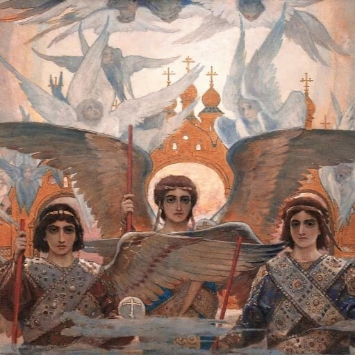 📍Владимирский собор в Киеве. 1885 - 1896 гг. Васнецовым создано 15 больших композиций и 30 отдельных фигур. К работе в соборе Васнецов подготовился – изучил древнерусскую иконопись, съездил в Италию, увидел византийские фрески. Больше всего вдохновила мозаика Равенны. Концепция росписи основывалась на идее осмысления русского православия и попытке сблизить церковь с народом, сделать искусство более доступным и понятным. Васнецов сохранил византийские традиции в выборе сюжетов, но внес свое личное видение, много отступая от канона. Рассмотрим поподробнее несколько изображений: 🔸"Единородный сын". Иисус Христос в облике юноши, окруженный символами четырех евангелистов. Лука- бык, Марк- лев, Матфей- ангел, Иоанн- орел. Цветовая гамма эскиза очень нежная и воздушная, отражающая небесную голубизну. Белые одеяния Христа делают его фигуру буквально светящейся. 🔸"Бог Саваоф" Саваоф – одно из имен бога, означающее «Господь воинств Ангельских». Именно этот смысл обыгрывает Васнецов: фигура Бо