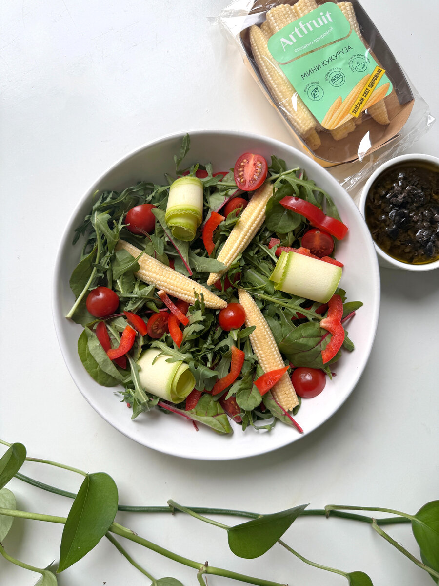 Одна из самых популярных представительниц нашей Зеленой полки. И не случайно! Мини-кукуруза не только вкусная, но и очень полезная. А вы знаете, как ее правильно есть? Делимся секретом (будет в конце) и рецептом освежающего салата! Ингредиенты: ✔️Мини-кукуруза Артфрут – 1 уп. ✔️Кабачки молодые – 30 г. ✔️Салатные листья – 70 г. ✔️Перец красный – 1 шт. ✔️Помидоры черри – 70 г. ✔️Соль, перец чёрный молотый – по вкусу ✔️Оливковое масло – 42 мл. (для соуса) ✔️Сок лимонный – 30 мл. (для соуса) ✔️Маслины без косточки – 70 г. (для соуса) Способ приготовления: 1. Готовим соус: мелко рубим маслины и смешиваем с соком лимона и оливковым маслом 2. Черри разрезаем пополам, красный перец – небольшими ломтиками, кабачок – тонкими слайсами с помощью овощечистки 3. Кабачковые слайсы сворачиваем в рулетики 4. Собираем салат: на дно салатника выкладываем салатные листья, сверху – черри, перец, мини-кукурузу и рулетики из кабачков 5. Перед подачей поливаем соусом и перемешиваем. Секрет: мини-кукурузу мо