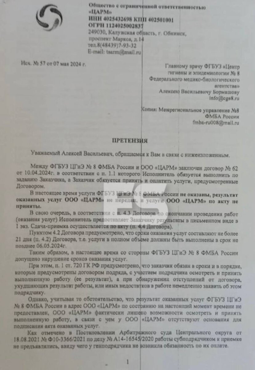 Руководство ООО "Царм" обратилось в ФГБУЗ "Центр гигиены и эпидемиологии № 8 ФМБА России" за получением санитарно-эпидемиологического заключения на право работы с микроорганизмами 3-4 групп патогенности.