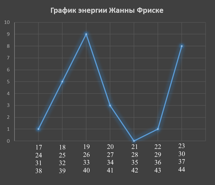 Жанна Фриске умерла от рака мозга. И мы видим, что по 8 энергии возможны проблемы с мозгом, а по 9 – онкология. Это произошло в 2015 году, что на графике энергии Жанны соответствует энергии 0. Чуть меньше месяца она не дожила до 42-летия.