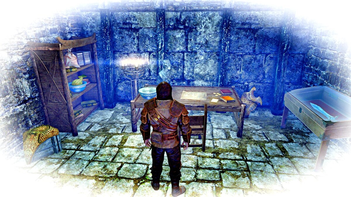 Интересная история одного меча из Сиродила. ...В The Elder Scrolls IV: Oblivion Герой Кватча помогает фермерам графства Коррол избавиться от нашествия гоблинов: Старик - фермер (очевидно, когда-то бывший воином) в благодарность за услугу дарит герою свой меч под названием Охладитель: Лично я пока прибрал меч в сундучок в своей лачуге в Имперском Городе; другие игроки возможно тоже хранили на память или же продали торговцам. Но волей создателей "Древних Свитков" меч Охладитель спустя века оказался в Скайриме... Помните тот момент, когда Довакин в поисках планов предавшего Гильдию Воров Мерсера Фрея пробирается в его дом? В тайной комнате Фрея кроме его планов в витрине находится Охладитель: А из найденной тут же записки выясняется, что меч хранился в Мрачном Замке: Внешний вид меча в обоих частях игры немного отличается; но без сомнения, это тот же самый Охладитель - стеклянный одноручный меч уникального в сравнении с прочим стеклянным оружием голубоватого оттенка. Как Охладитель попал