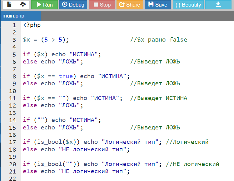 Почти во всех языках программирования есть логический тип данных, с помощью которого можно работать с булевыми значениями типа ДА/НЕТ или ИСТИНА/ЛОЖЬ (TRUE/FALSE). Хотя раньше спокойно обходились и без этого. Например, в чистом С такого типа не было. Да и в некоторых других языках такого типа тоже нет, а вместо этого используются числа. Например, 0 можно считать логическим нулём, а любое другое число - логической единицей. PHP, как всегда, идёт своим путём. И здесь для работы с логическими значениями можно использовать как ключевые слова, так и числа и значения других типов. То есть некоторые значения PHP определяет как истинные, а другие - как ложные. И это придётся запоминать или держать где-то краткую памятку (например, можно добавить эту статью в закладки))). Истинность или ложность проверяется оператором if (значение). Также результат какого-то логического выражения можно присвоить переменной. В РНР следующие значения эквивалентны false (являются ложными): Всё, что отличается от т