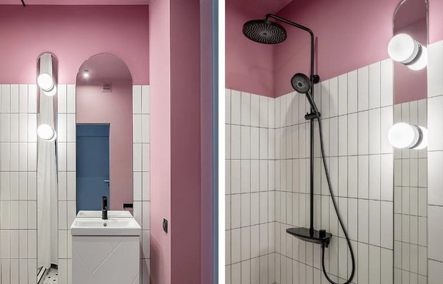 Яркий дизайн гарантированно подарит порцию вдохновения Заказчик обратился к дизайнеру Нике Чередниковой с интересной задачей: на площади 34 кв. м ей предстояло организовать две отдельные студии со всем необходимым для комфортной жизни — от кухни и спального места до санузла. И Ника отлично справилась: если вам тоже предстоит оформить небольшую ванную комнату, в этом проекте можно подсмотреть несколько гениальных идей, а также запомнить полезные советы. Санузел в первой студии получился очень компактный: он занимает всего 2,5 кв. м. Для отделки пола использовали керамогранит, как в общей зоне, а для инсталляции и в зоне душевой задействовали базовый белый керамогранит. Красивый эффект санузлу придали интересный цвет стен и зеркала в форме арок. У Ники есть несколько советов, которые помогут сэкономить бюджет и оформить нестандартный санузел. Во-первых, использовать меньше плитки и больше краски: в случае с плиткой материал и работа стоят дороже, нежели в случае с покраской стен. Во-втор