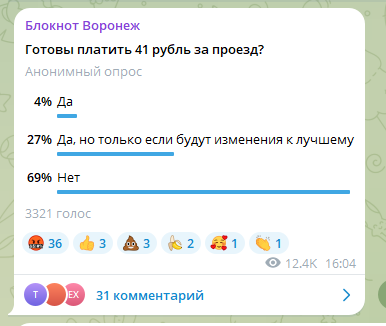 Воронежцы хотят улучшений. В Воронеже могут повысить проезд в общественном транспорте до 38 рублей (за безналичный расчет) и 41 руб (за наличный). Городское управление транспорта уже направило в министерство тарифного регулирования документы с обоснованием роста. Профильная структура пообещала изучить предоставленные документы за 60 дней. Пока вопрос «подвис» в воздухе, мы спросили у своих подписчиков в telegram-канале, готовы ли воронежцы платить 41 рубль за проезд. В опросе приняли участие 3,3 тыс человек. 69% ответили отрицательно. 27% подписчиков заявили, что готовы платить, если будут изменения в лучшую сторону. 4% согласны платить такую сумму. Отметим, в Воронеже один из самых низких тарифов на проезд. Например, в Твери и Омске он стоит по 30/35 руб, в Волгограде – 30/32 руб, в Самаре – 35/38 руб, в Казани – 38/42 руб. Филипп Котов