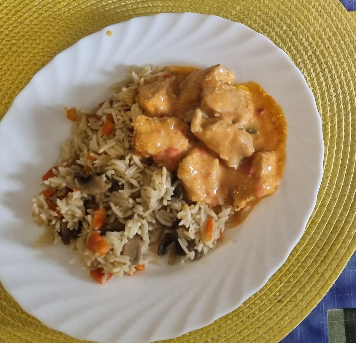 Нам нужно: Лук мелко режем и томим его немного на сковороде, добавляем порезанную на крупные кусочки индейку, обжариваем до подрумянивания, минут 7-10. Разводим сметану где-то в 200 мл воды или бульона, добавляем муку, перемешиваем до исчезновения комочков, переливаем в сковороду. Соус должен закрывать индейку, если надо долейте воды. Тушим минут 10. Нарезаем помидор и болгарский перец и отправляем к индейке. Тушим на минимальном огне еще минут 20. В оригинальном рецепте паприку добавляют в самом начале к обжарке лука, но, я считаю, специи нужно добавлять в конце варки. Поэтому я добавляла специи за 5 минут до окончания готовки, так же и солила тогда же. Вы можете добавлять когда хотите))