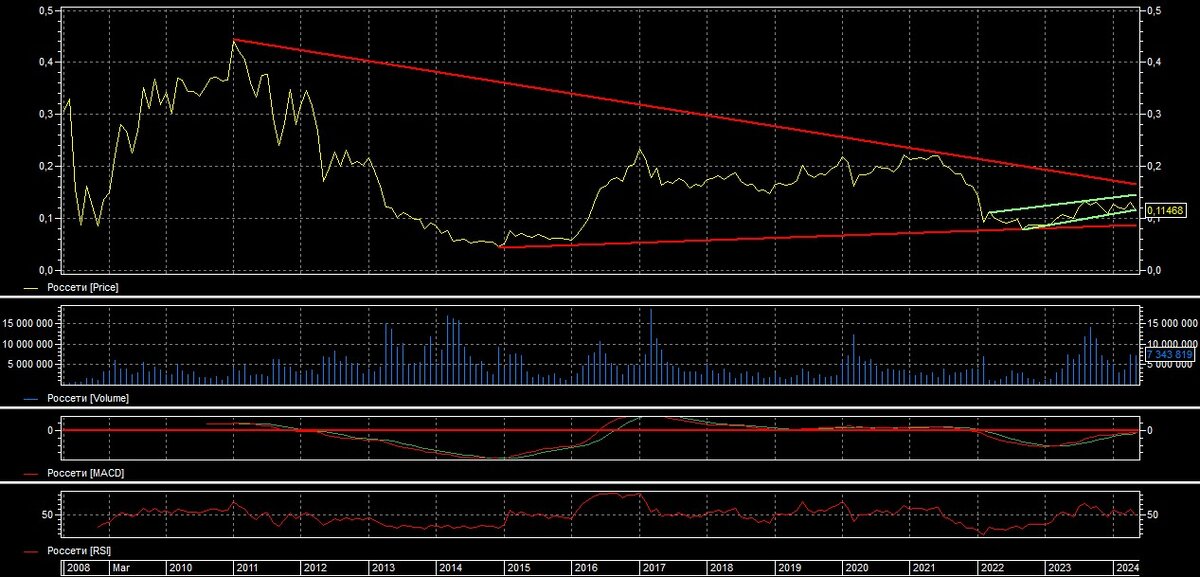 Недельный график показывает, что акция ФСК Россети не завершила просадку, есть вероятность ухода акции на уровень 0,1. Растущий коридор 0,116-0,146 расположен внутри сужающегося тренда 0,088-0,16.