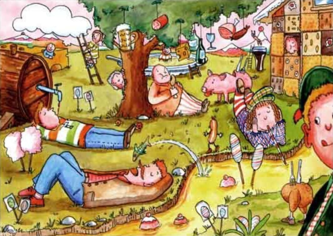 #символика Сказочное, символическое место для праздных людей и жаждущих развлечений лентяев. Это непонятное сегодня название происходит от слов «шлур» (ленивый человек); «шлурен» (работать кое-как, небрежно) и «аффе» (обезьяна), отсюда старое написание «шлураффенланд» в книге Себастьяна Бранта «Корабль дураков». «Шлураффен» — так называют в ней глупцов, которые рассчитывают, однако, заслужить хорошую жизнь. Сюжет построен так, что им дают понять: подобное возможно не в реальном мире, а только в далекой сказочной стране («шлаураффенланд» у Ганса Сакса, у Гриммельсхаузена в его «Симплициссимусе» и у братьев Гримм). Порой «шлараффенланд» (так в более поздних текстах), независимо от основного сатирического значения, изображается просто как «перевернутый мир», что соответствует некоторым представлениям о потустороннем мире. Игриво-детские мотивы подобной отрешенности от суровой реальности характерны и для союза художников «Шлараффия», основанного в 1859 г. в Праге («Всемирный союз Всешлараф