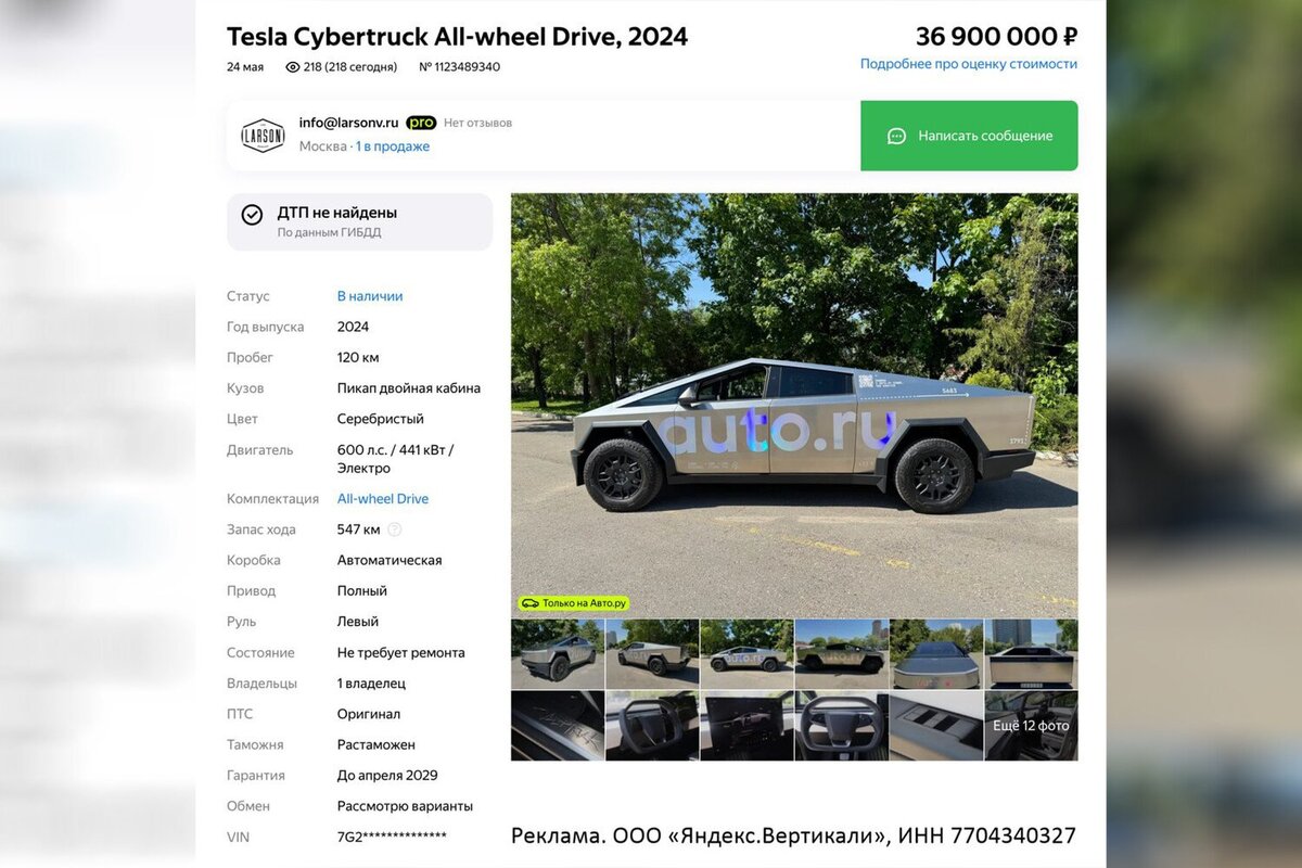 Автомобиль предлагается приобрести за 36,9 млн рублей. Отмечается, что у машины пробег составляет 120 км, у нее был только один владелец. Судя по объявлению, автомобиль растаможен, а гарантия на него будет действовать до 2029 года. Tesla Cybertruck — это электромобиль-пикап в стиле киберпанк от компании Tesla. Компания заявила грузоподъемность авто около 1,6 тонны. В зависимости от модели на одном заряде пикап должен проезжать до 800 км. Производство полноприводных двухмоторных и трехмоторных версий Cybertruck планировалось начать в конце 2021 года, а заднеприводной одномоторной модели — в конце 2022 года, но производство было перенесено на 2022 год, а затем на начало 2023 года. Мария Жандарова