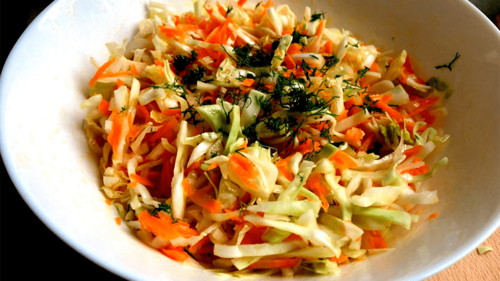 - А теперь все идём на кухню! На обед у нас будут котлетки из куриного фарша и весенний салат! Олеся его замечательно готовит из капусты, редиски, огурцов и помидоров, а также режет туда молоденький укроп, лук и чубчик чеснока!