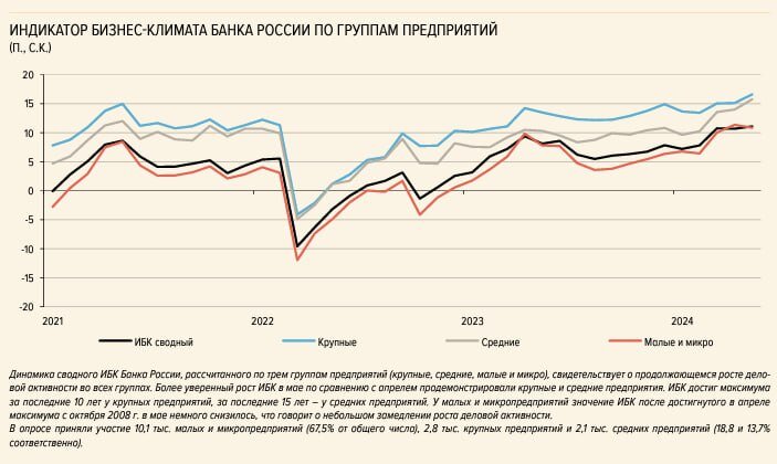 Индикатор бизнес-климата Банка России в мае увеличился до 11,1 п. Майский показатель – это новый максимум за последние 12 лет. Банк России считает, что экономика растет и рекордный показатель свидетельствует о продолжении интенсивного роста деловой активности.