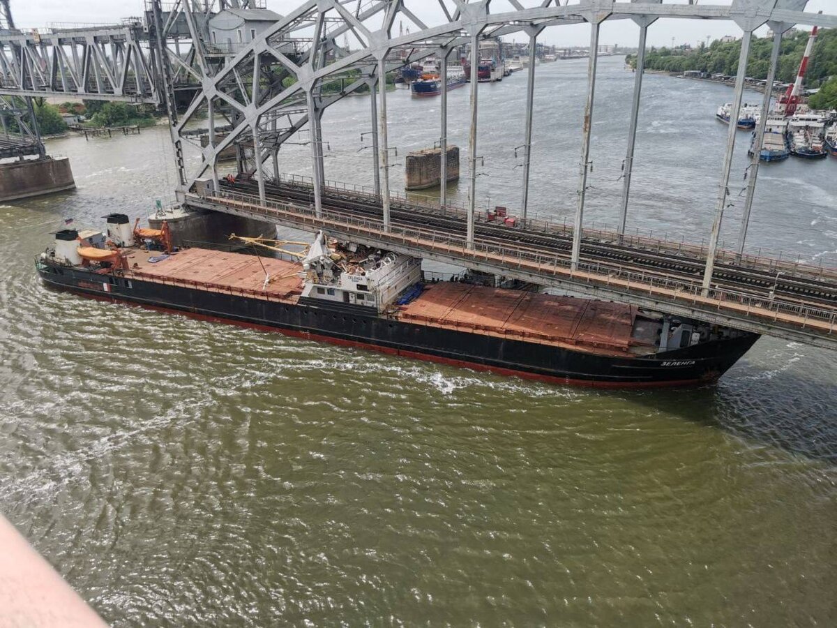 Сухогруз врезался в пролет железнодорожного моста в Ростове-на-Дону. Об этом сообщает Telegram-канал Baza